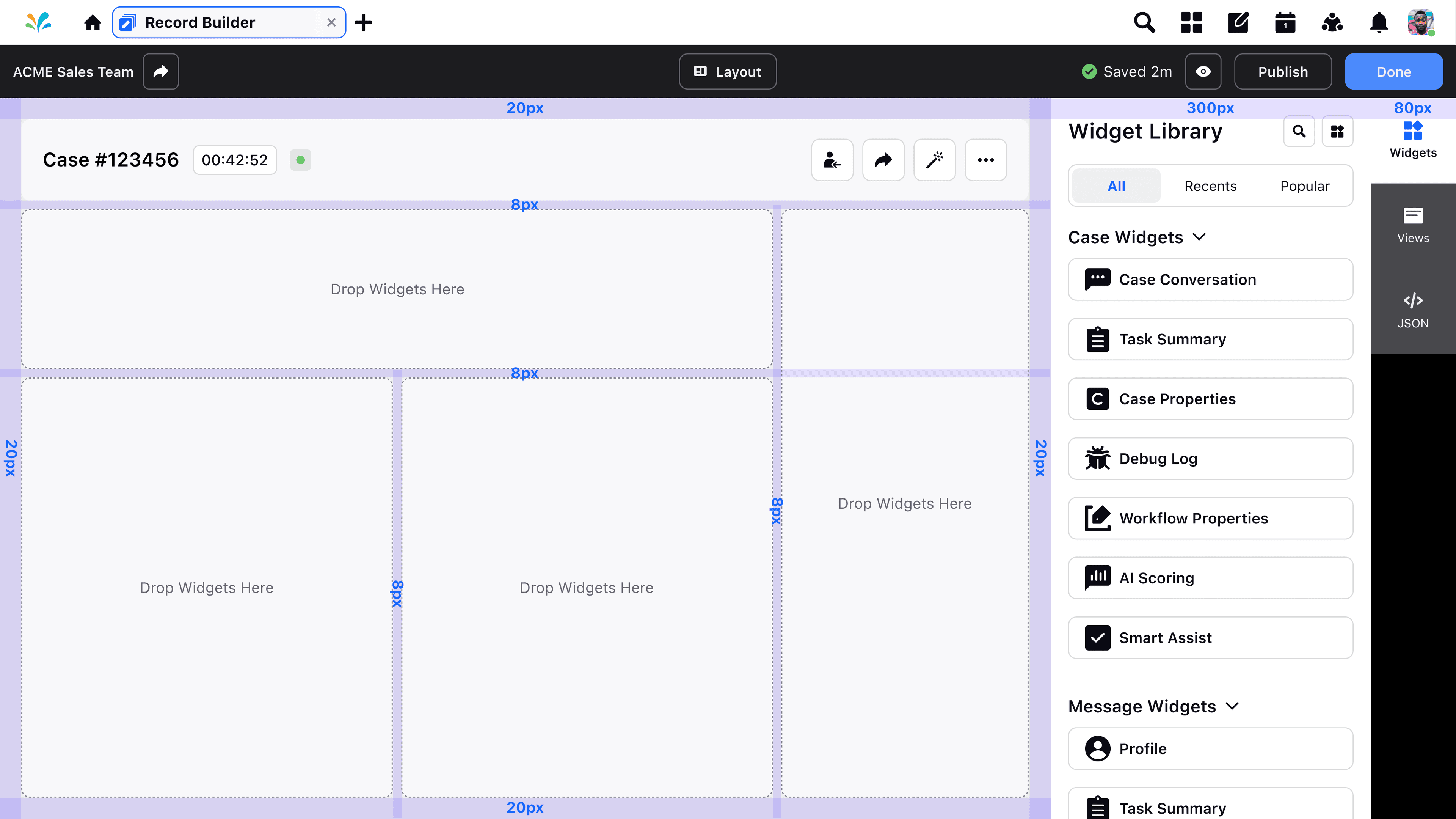 I redesigned of Sprinklr's Agent Console Builder, a no‑code tool for assembling custom dashboards for customer service agents. The new experience improved adoption, reduced reliance on internal teams for setup, and established design patterns used across other builders.